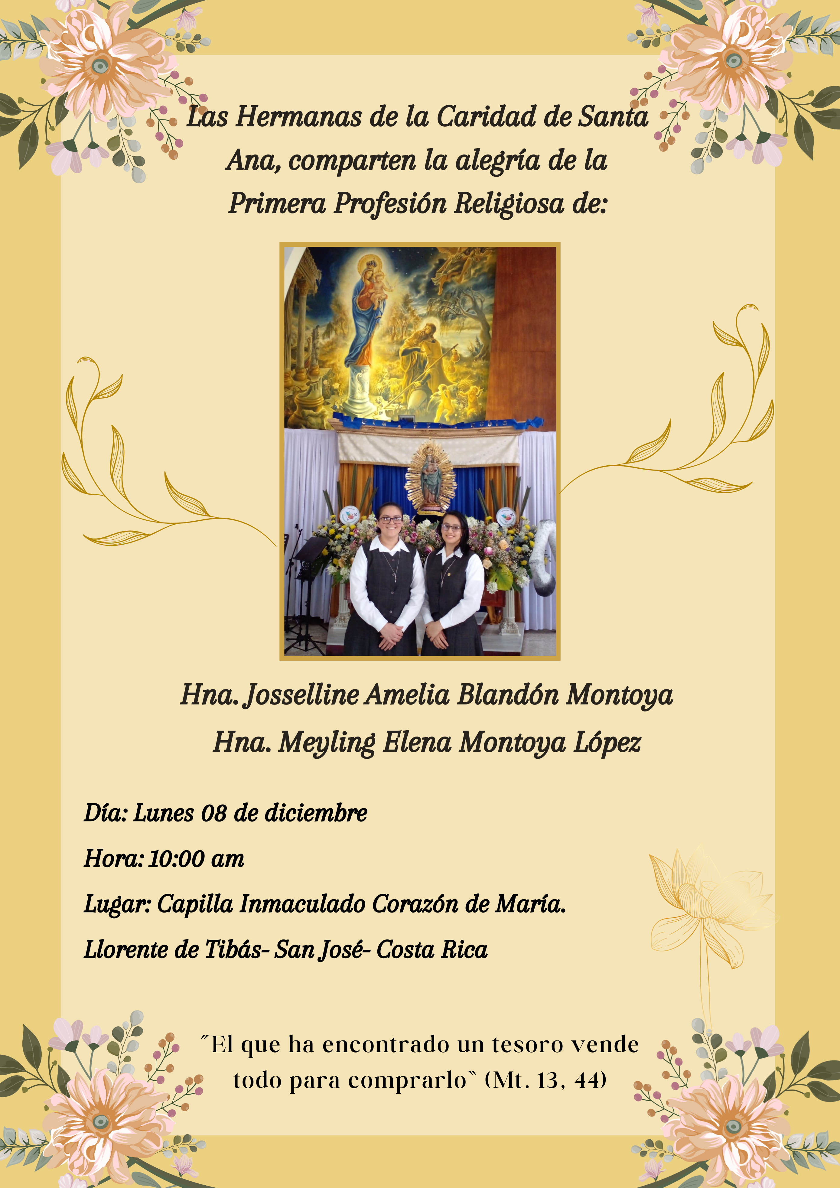 El día 8 de diciembre de 2025, las Novicias Josselline Amelia Blandón Montoya y Meyling Elena Montoya López, de la Provincia de Santa Ana, harán sus Primeros Votos en la Capilla del Inmaculado Corazón de María, en Llorente de Tibás (San José – Costa Rica), a las 10,00 h.