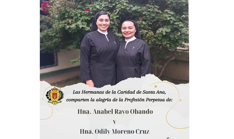 El próximo día 8 de diciembre de 2025, las Hnas. Anabel Rayo Obando y Odily Moreno Cruz, de la Provincia Santa Ana, harán su Profesión Perpetua. La celebración será a las 10,00 h. de la mañana, en la Capilla del Inmaculado Corazón de María, en Llorente de Tibás (San José – Costa Rica).