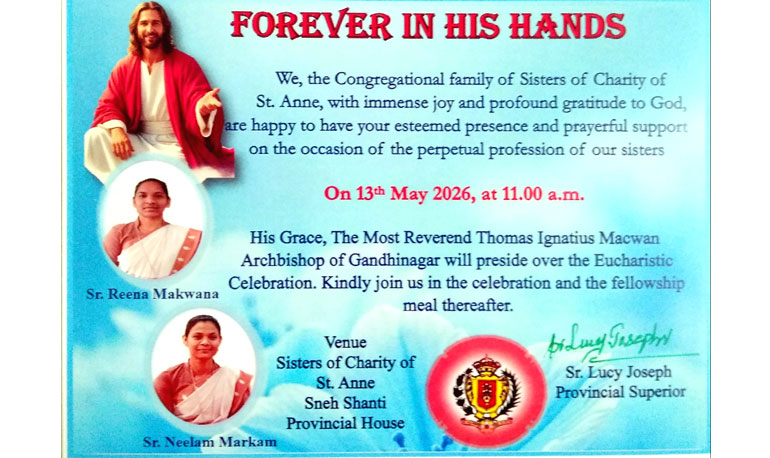 El próximo día 13 de mayo de 2026, en el marco de una celebración eucarística presidida por Mons. Thomas Ignatius Macwan, Arzobispo de la Diócesis de Gandhinagar, las Hnas. Reena Makwana y Neelam Markam, de la Provincia de Madre Pabla Bescós (Norte de India), harán su Profesión Perpetua. La celebración será a las 11,00 h. de la mañana, en la Capilla de la Casa Provincial, Sneh Shanti, Sevasi-Vadodara (Gujarat - India).
