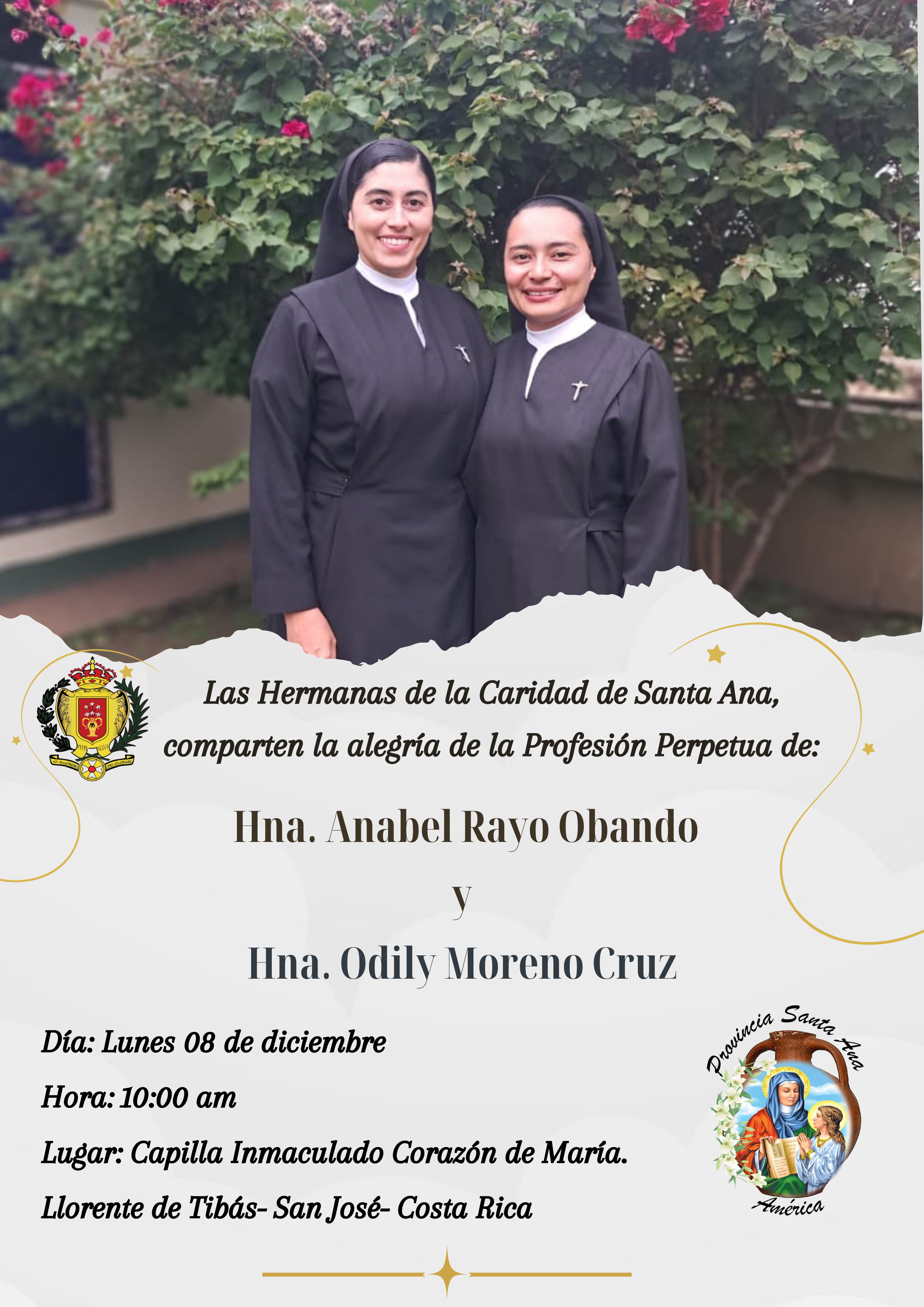 El próximo día 8 de diciembre de 2025, las Hnas. Anabel Rayo Obando y Odily Moreno Cruz, de la Provincia Santa Ana, harán su Profesión Perpetua. La celebración será a las 10,00 h. de la mañana, en la Capilla del Inmaculado Corazón de María, en Llorente de Tibás (San José – Costa Rica).